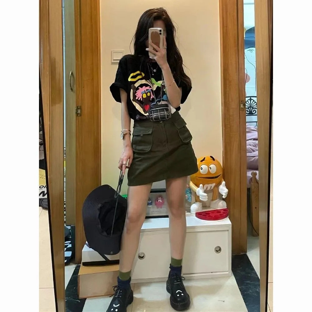Rok pendek Denim pakaian kerja anti-paparan a-line rok pendek pelajar wanita rok hijau tentara musim panas pelangsing pinggang tinggi