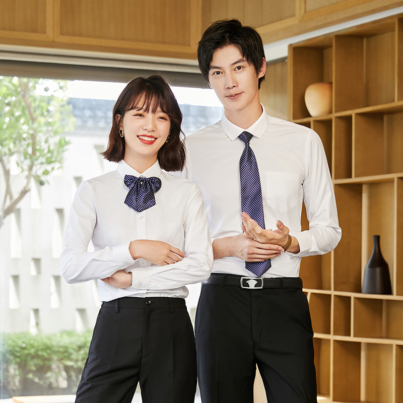 Pakaian bisnis wawancara mahasiswa mahasiswa, pakaian formal bisnis yang sama pria dan wanita, kemeja putih lengan panjang, setelan kemeja LOGO bordir