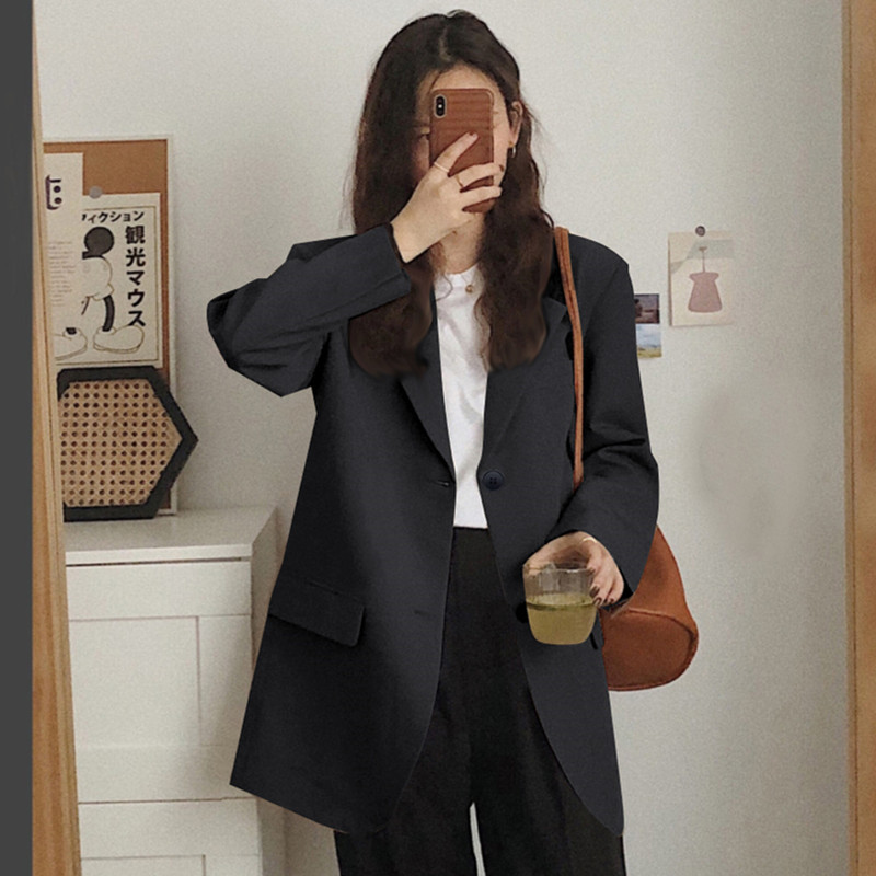 Jas wanita baru untuk musim semi dan gugur, gaya Korea, potongan longgar, gaya pelajar, blazer hitam baru 2025, setelan panjang sedang ala selebgram.