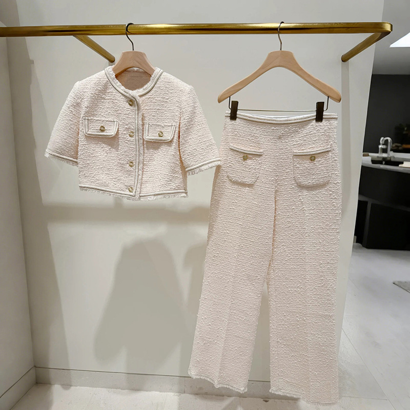 Prancis Niche 2025 Musim Semi Awal Musim Semi Tepi Berbulu Kerah Bulat Jaket Gaya Chanel Pinggang Tinggi Celana Panjang Bunga Set 25015