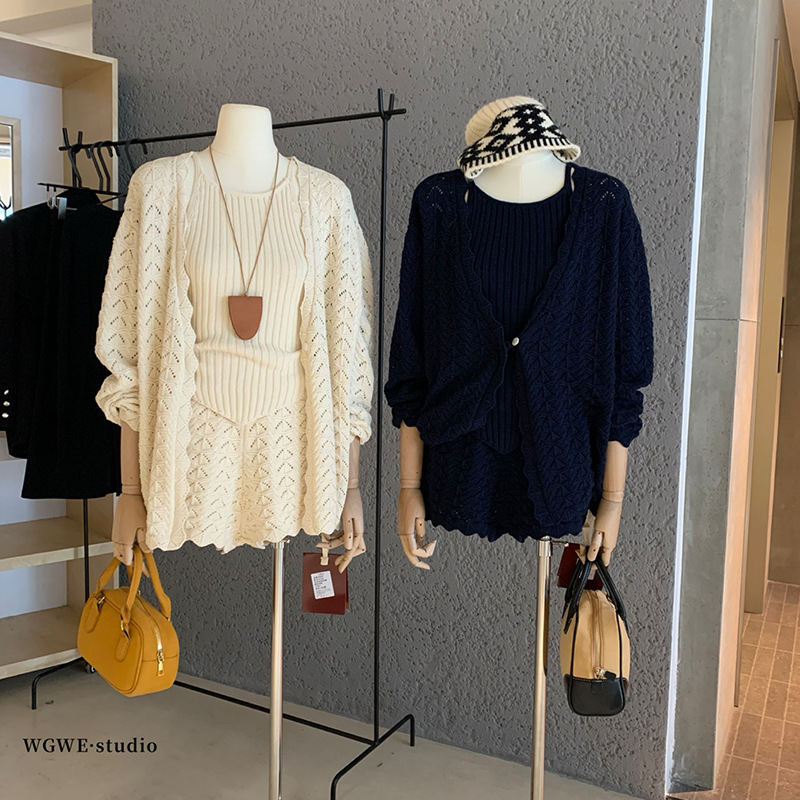 WGWE7230复古手工感镂空开衫吊带背心百搭短裤针织套装