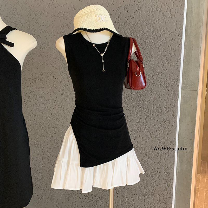 WGWE6521气质侧开衩纯欲风修身显瘦无袖背心上衣+半身裙