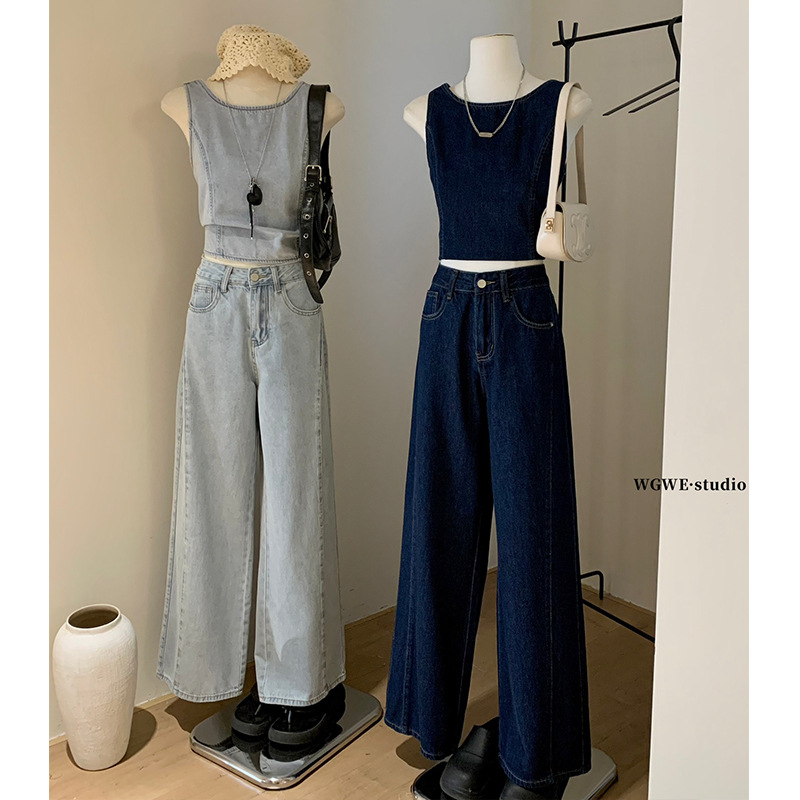 WGWE5707 Set dua potong denim vintage gaya Korea, rompi tanpa lengan musim panas dengan celana panjang lebar, modis dan elegan.