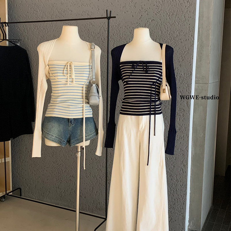 WGWE7527纯欲辣妹修身长袖针织开衫上衣条纹抹胸背心两件套