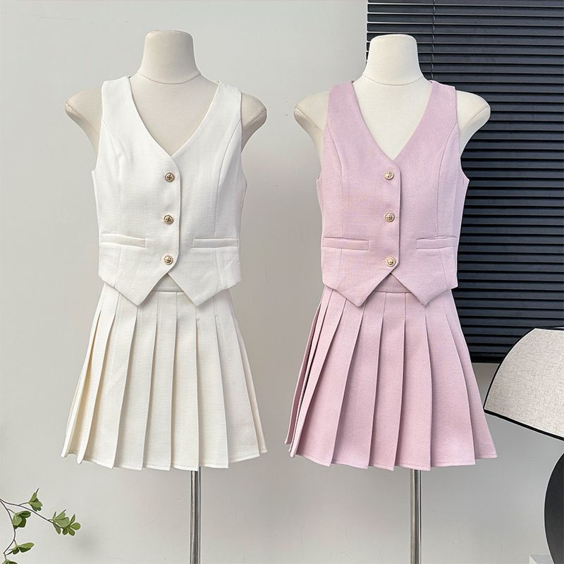 法式小香风单排扣开叉西装马甲吊带背心女夏季高腰百褶短裙两件套