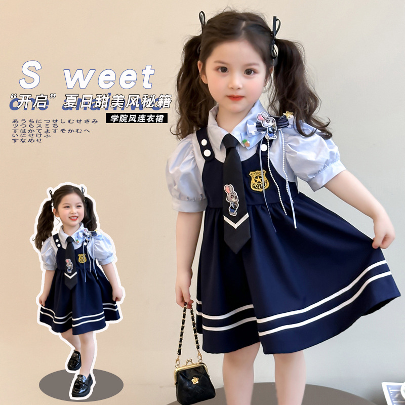 Gaun Polisi Kelinci Anak Perempuan Pakaian Musim Panas 3025 Pakaian Anak Model Baru Rok Putri Bayi Perempuan Gaya Kampus Jk