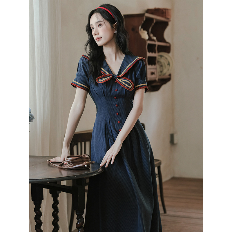 Gaun Kotak-kotak Seragam Kerah Angkatan Laut Warna Kontras Gaya Kampus Rok Panjang Terlihat Kurus Pelangsing Pinggang Mengurangi Usia Dipakai Siswa Musim Panas Wanita