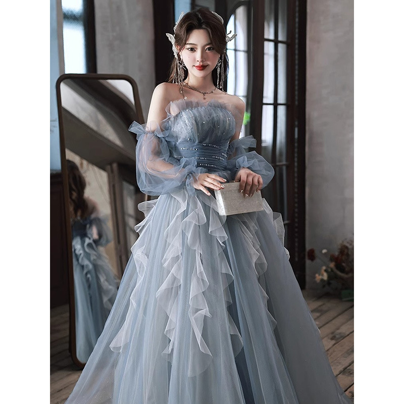 Meisheng kostum solo dress ujian seni siswa gaun malam host Mori mewah terang biru niche