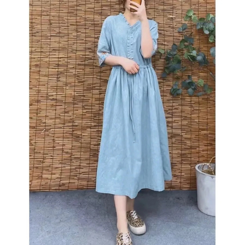 Gaun Jacquard Katun Tulen Bordir Artistik Retro Model Baru Musim Panas Gaya Etnik Membentuk Pinggang Terlihat Langsing Menutupi Daging Trendi