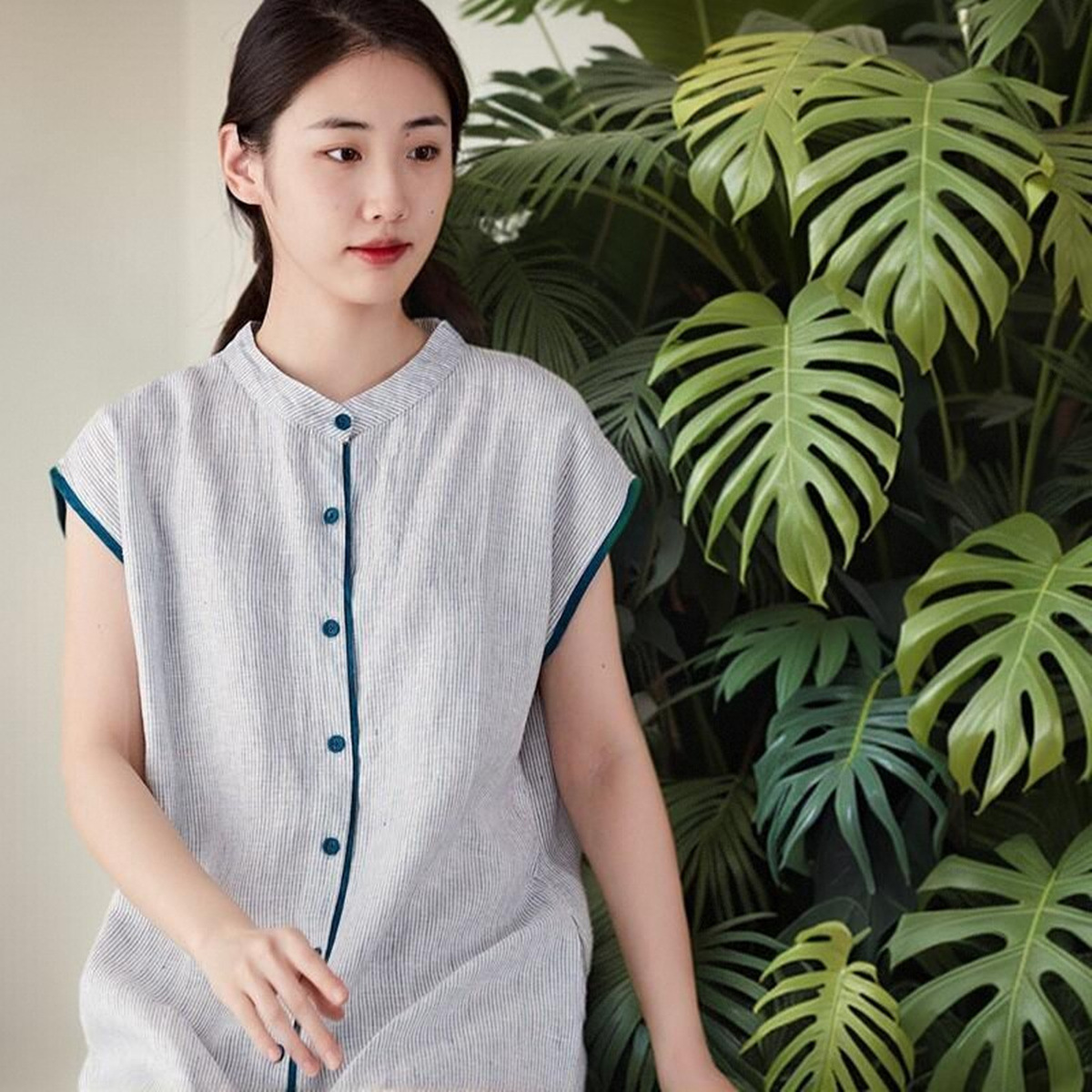 Gaun linen celup benang impor gaun kemeja kerah berdiri retro Tiongkok atasan merek biru wanita lengan pendek artistik intelektual