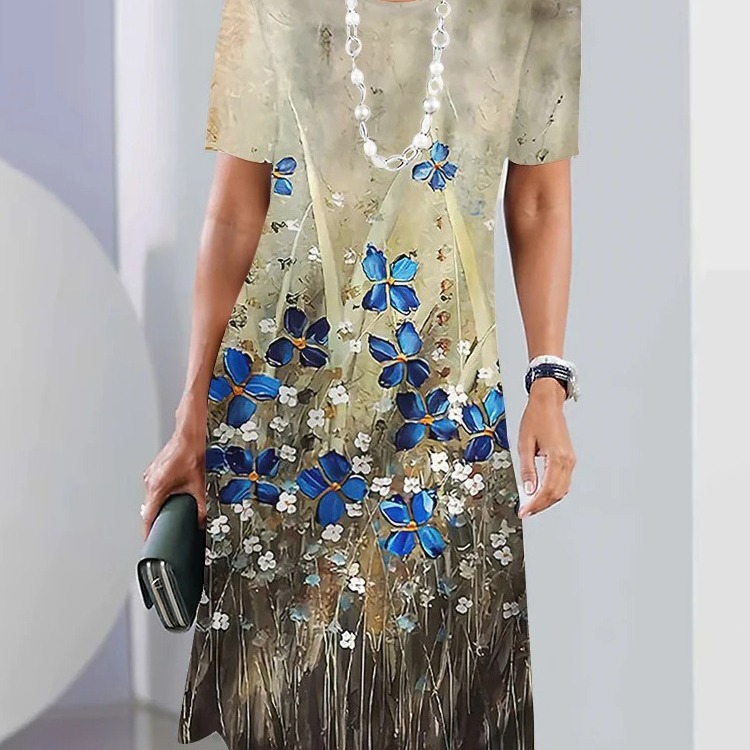 Gaun kaus Wanita lengan pendek, gaun rok kasual serbaguna bercetak 3D leher bulat 2024 ukuran teman