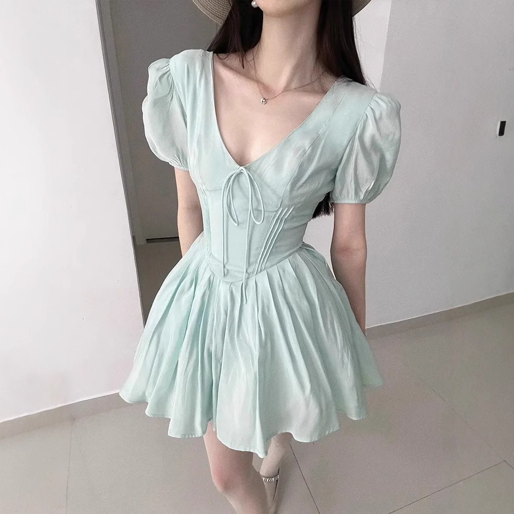 Gaun Lengan Busa Kerah V Warna Hijau Mint Manis Gaya Korea Rok Pendek Putri Liburan Pantai Musim Panas Siswa Wanita