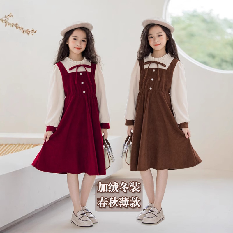 Gaun palsu dua potong untuk anak perempuan, gaun pelajar korduroi princess manis musim semi 2024, Gaun retro warna kontras untuk anak perempuan