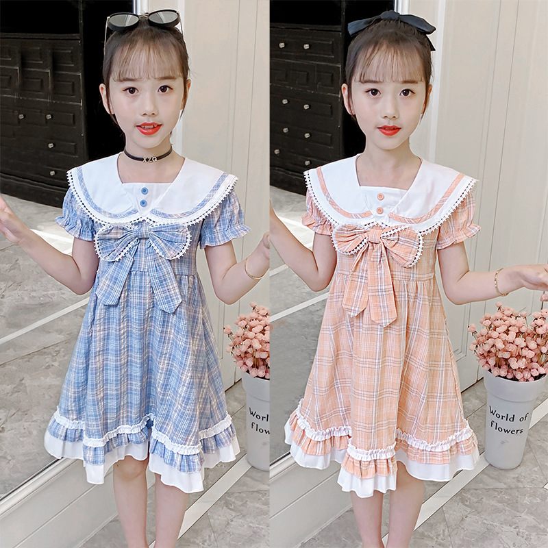 Gaun lengan pendek anak perempuan, rok kotak-kotak seragam JK, Gaun pita gaya preppy baru musim panas