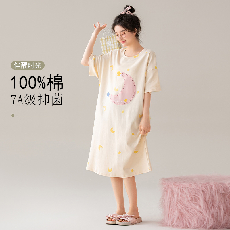 Gaun Tidur Lengan Pendek Katun Murni Anti Bakteri Kelas A Gaun Musim Panas Wanita Piyama Katun Murni Murid Gadis Model Panjang Sedang Wanita