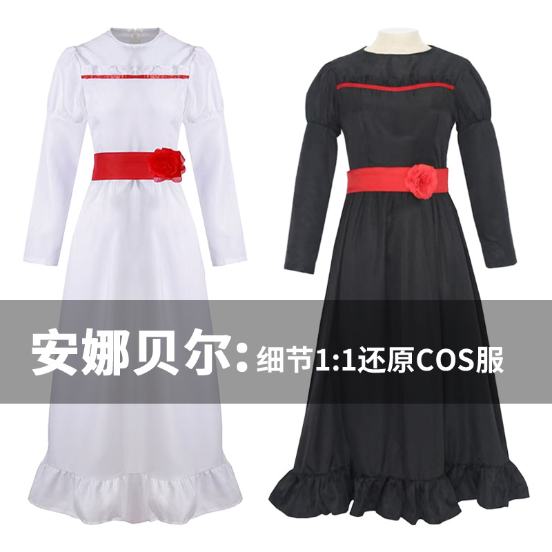 Annabelle Cos Kostum Pertunjukan Panggung Halloween Dua Dimensi Boneka Horor Gaun Putih Cos