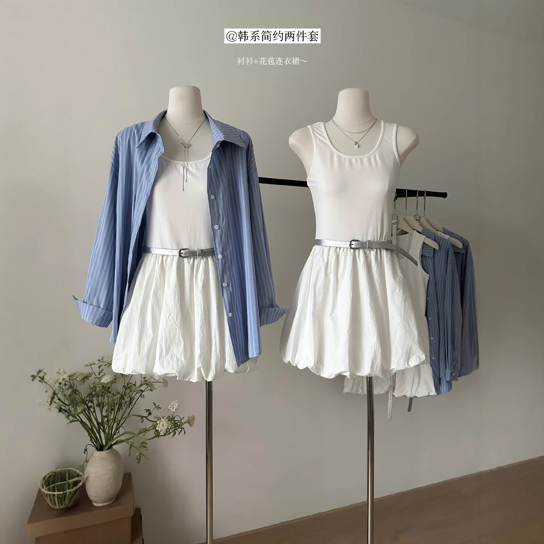 MILLAIDI Rompi Putih Gaun Motif Bunga Set Kemeja Lengan Panjang Longgar Garis-Garis Gaya Prancis Gaya Malas dengan Ikat Pinggang