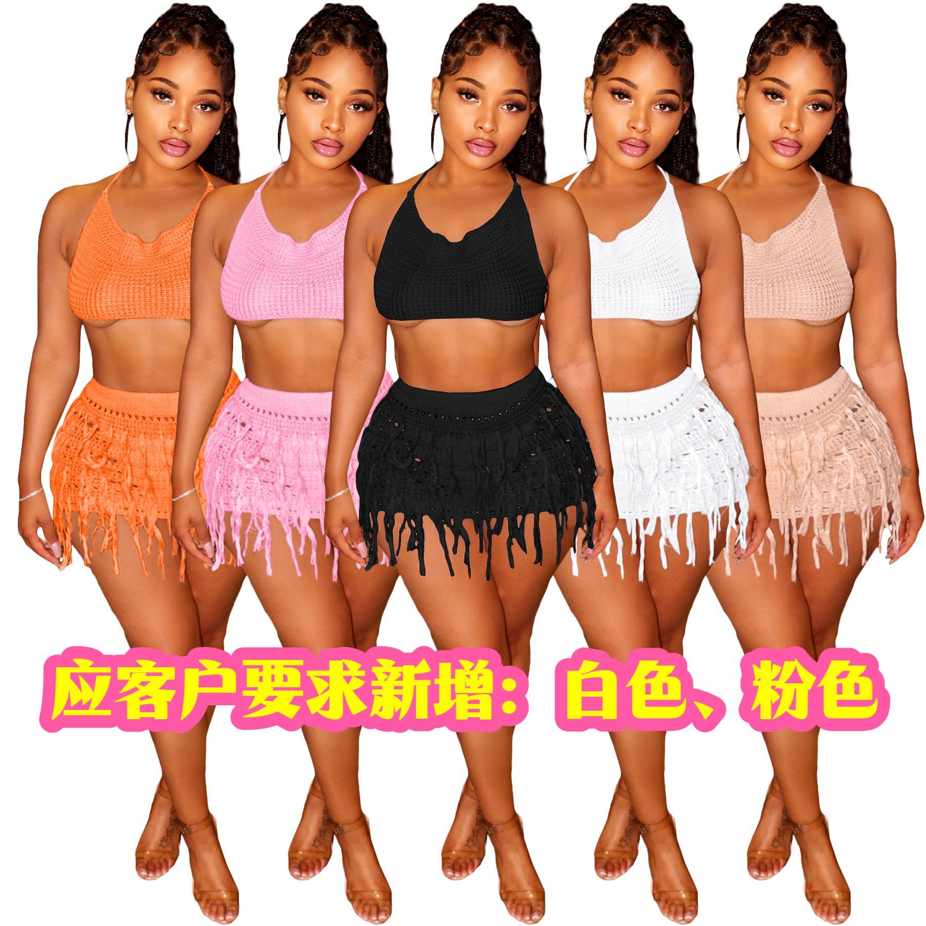 JP1095 Pasokan Lintas Batas Pakaian Wanita Eropa dan Amerika Rajutan Kait Tangan Berongga Rumbai Rok Pendek Seksi Dua Set