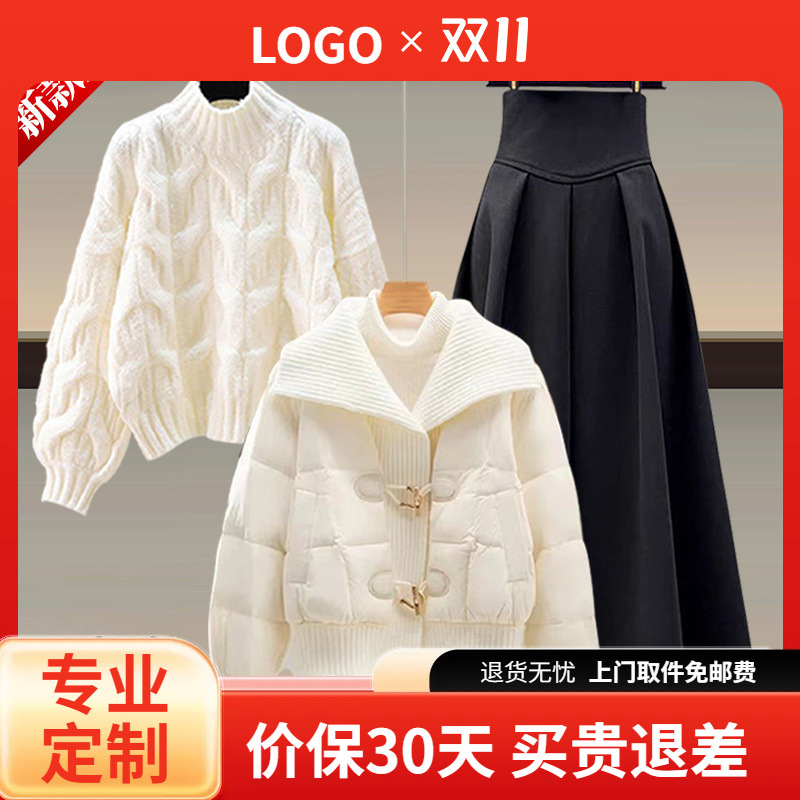 春秋季套装裙女小香风穿搭牛角扣棉服外套麻花毛衣半身裙子三件套