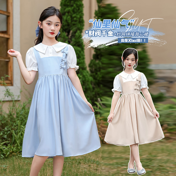 女童夏季新款时尚学院风假两件连衣裙学生女孩洋气休闲泡泡袖裙子