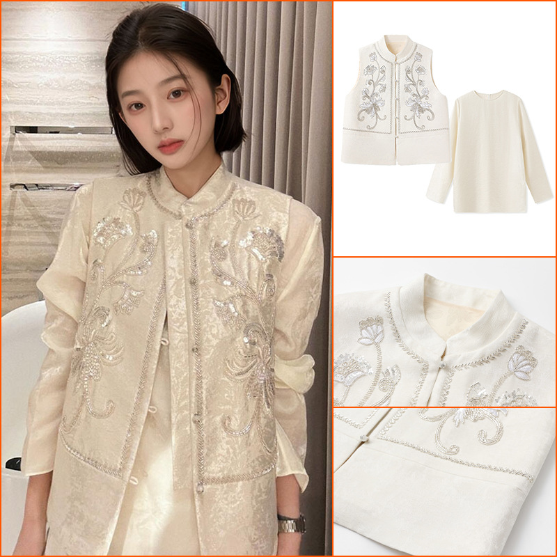 Kemeja desain bordir payet mewah bergaya Cina baru, model kerah tegak kancing depan, gaya nasional musim semi 2025, MZ064.