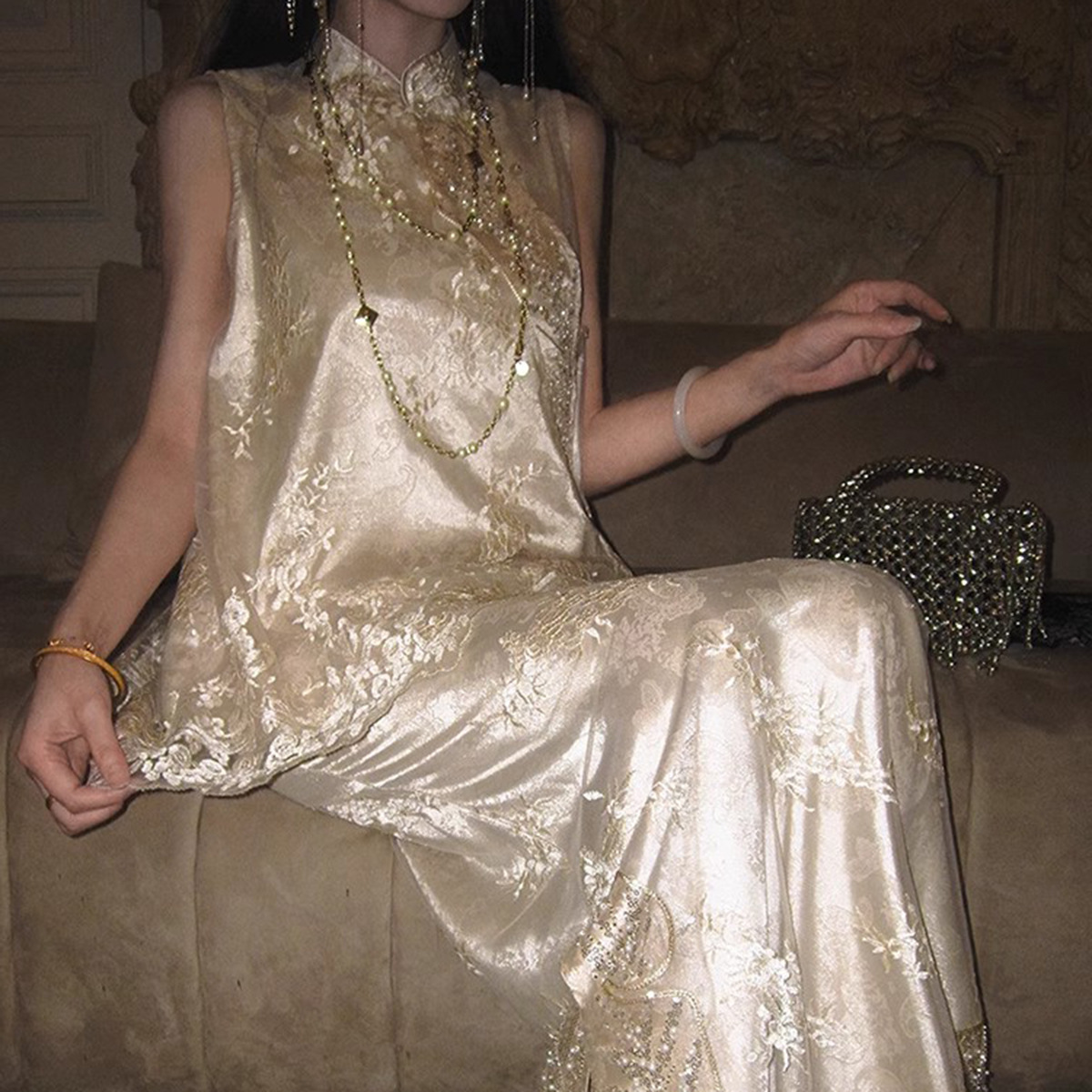 Gaun cheongsam tanpa lengan gaya Tiongkok, setelan fesyen kardigan Super peri dua potong baru 2024