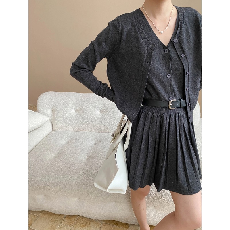 司南 慵懒博主风 法式高级感针织开衫V领背心连衣裙套装 SN8097