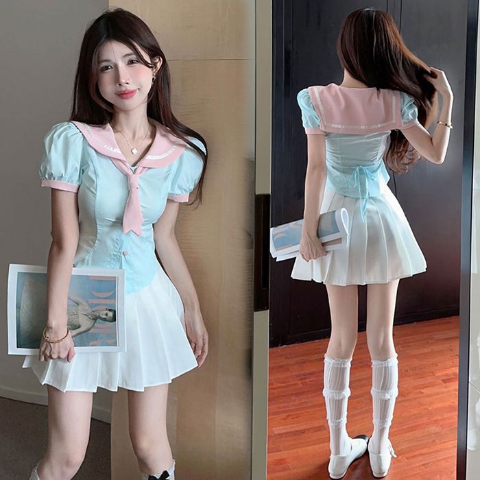 Setelan Seragam JK Gaya Kampus Kemeja Lipit Rok Tali Sambungan Warna Kontras Pinggang Tinggi Setelan Wanita Musim Panas Terlihat Kurus Gaya Barat
