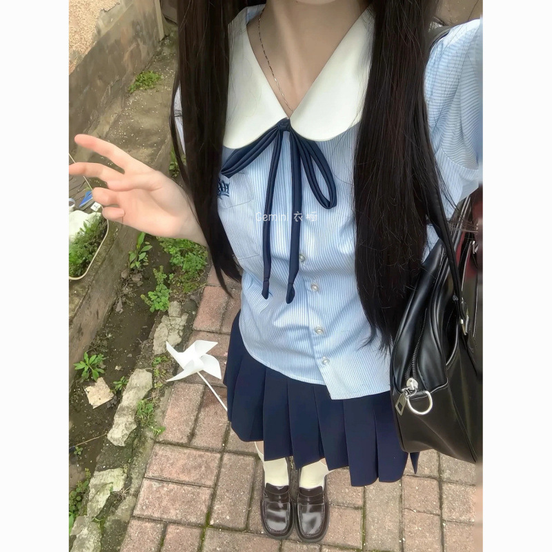 Kemeja Lengan Pendek Kerah Boneka Biru JK Gaya Kampus Atasan Murid Sekolah Longgar Manis Gaya Jepang Model Baru Musim Panas Wanita
