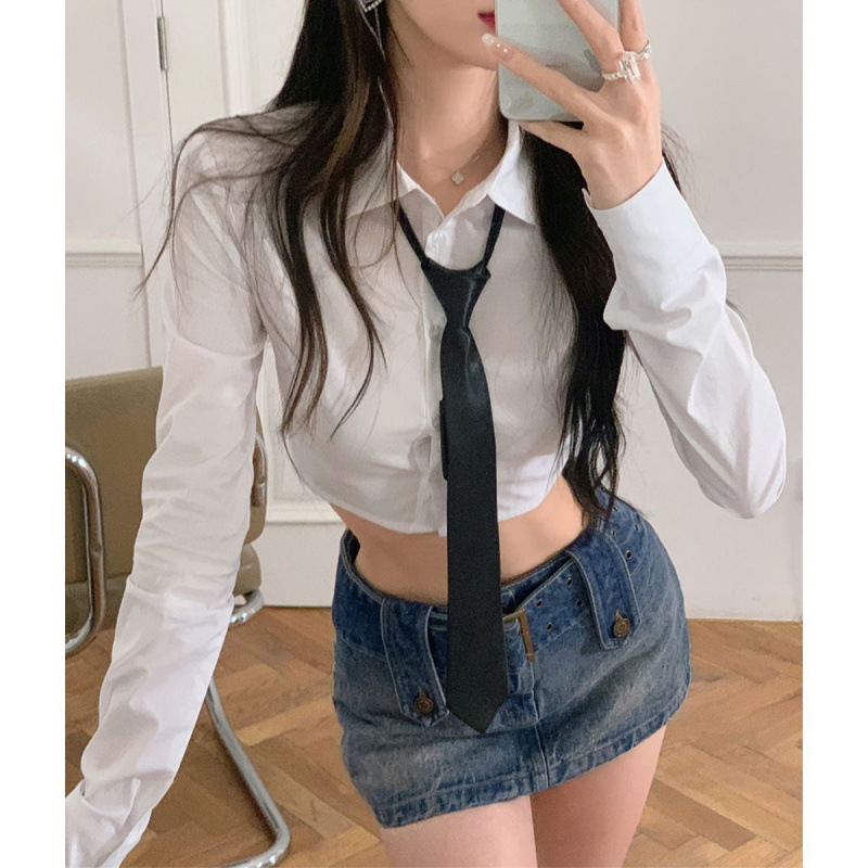 Kemeja JK Warna Putih Pelangsing Pinggang Gadis Murni Hsu Kemeja Dasi Membentuk Tubuh Niche Gaya Desain Atasan Model Pendek Musim Semi Wanita