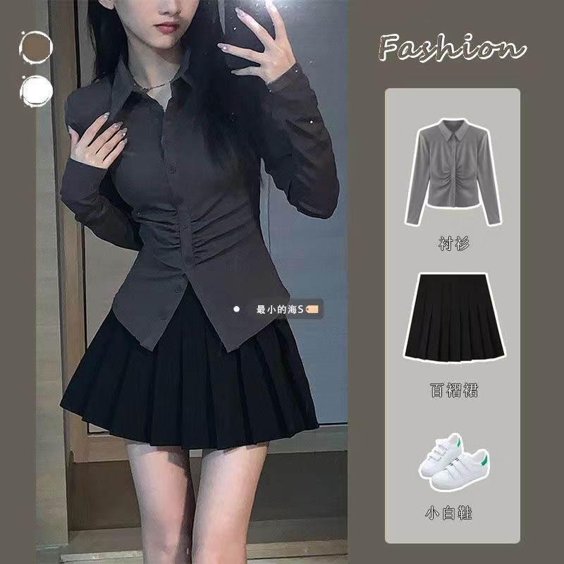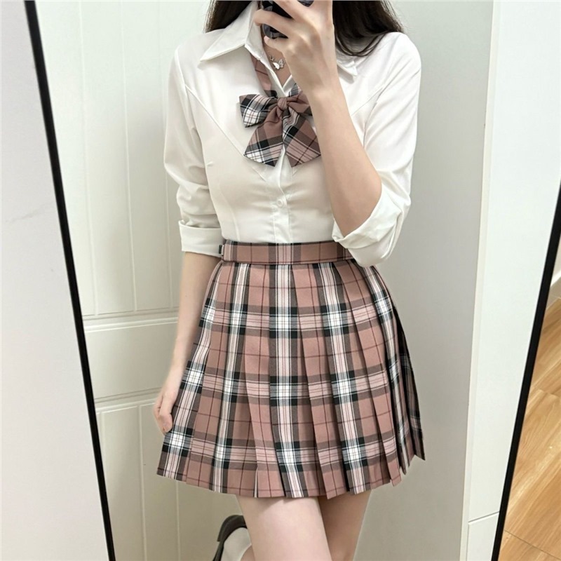 Setelan Baju Atasan Rok Lipit Membentuk Tubuh Asli Seragam JK Warna Putih Setelan Baju Atasan Kemeja Pelangsing Pinggang Gaya Sekolah Gadis Pedas