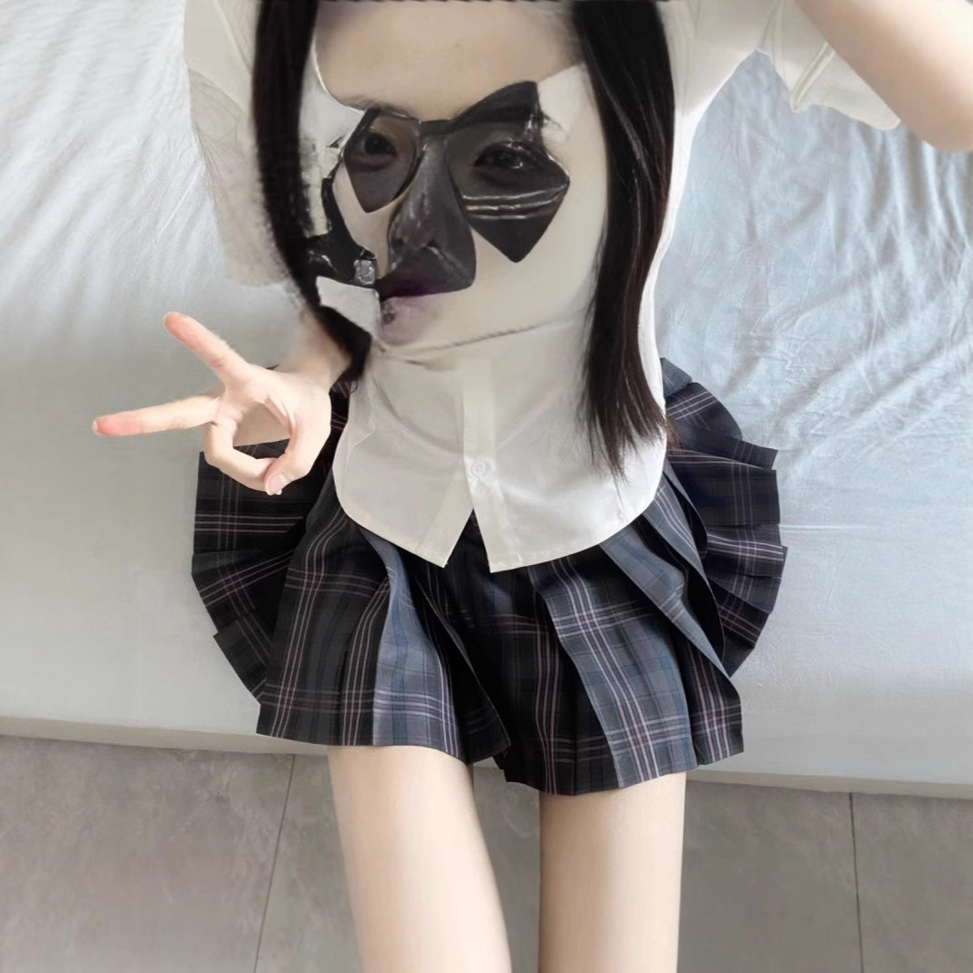 Setelan Gaya Sekolah Gadis Pedas Amerika Kemeja Warna Hitam Biru Seragam Polisi Kelinci JK Rok Lipit Rompi 3 Set