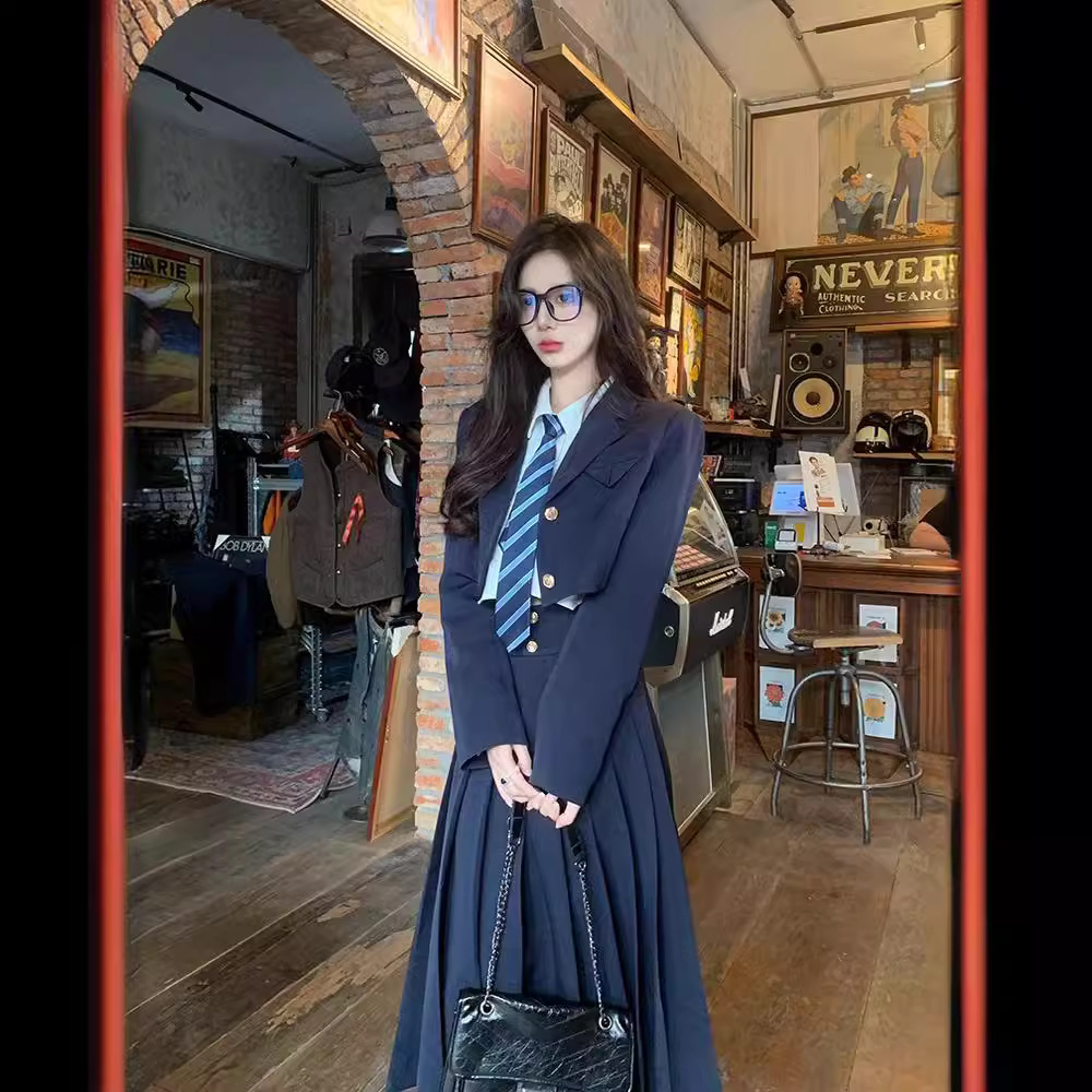 Setelan pakaian gaya Korea, setelan seragam JK, baju jaket modis, rok panjang sedang, Rok lipit pelangsing, tiga potong