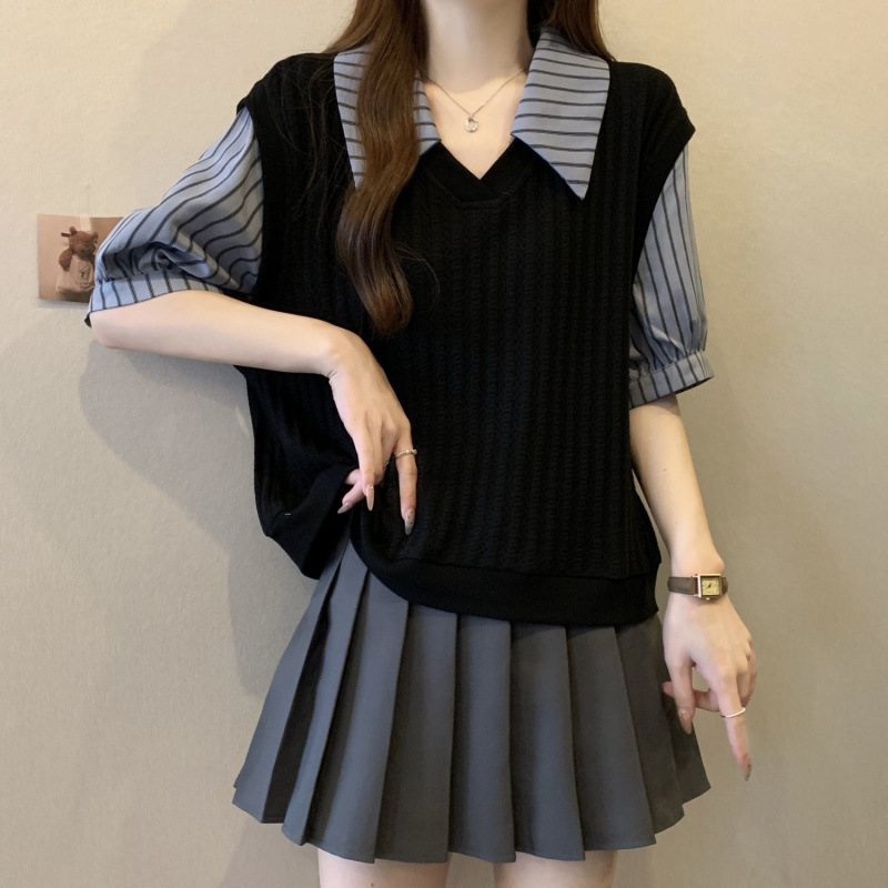 Pakaian Pelajar Model Populer Selebgram Kemeja Garis Biru Model Baru Musim Panas Kemeja Rajut Lengan Pendek Kombinasi Atasan Gemuk Palsu Dua Potong