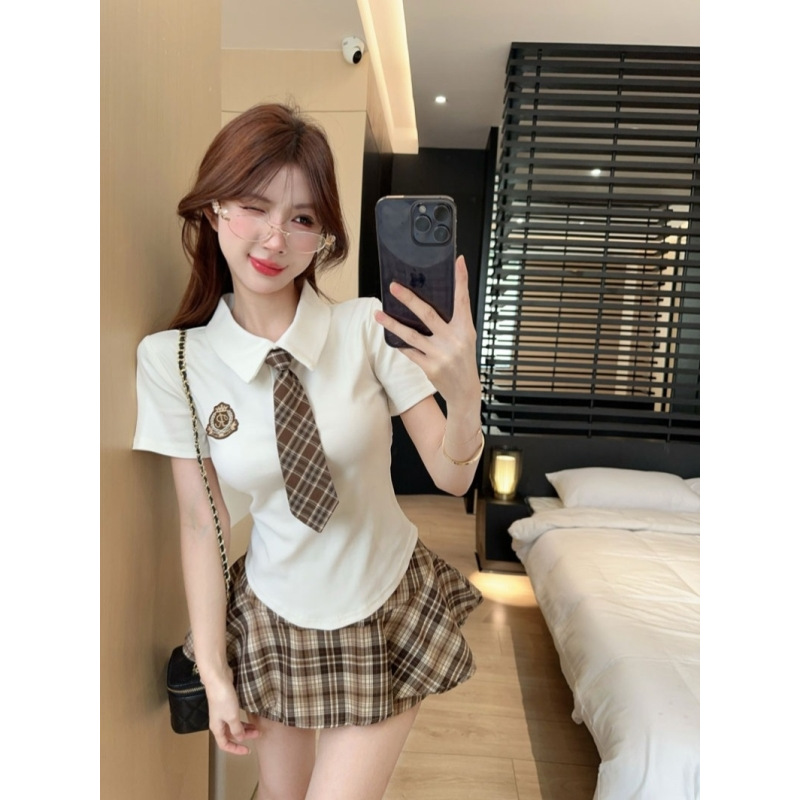 Atasan Model Pendek Mengurangi Usia Membentuk Tubuh Gaya Sekolahan Elegan Model Baru Gaya Perancis T-shirt Pelangsing Pinggang Tinggi Rok Celana Kotak Jk Tiga Potong