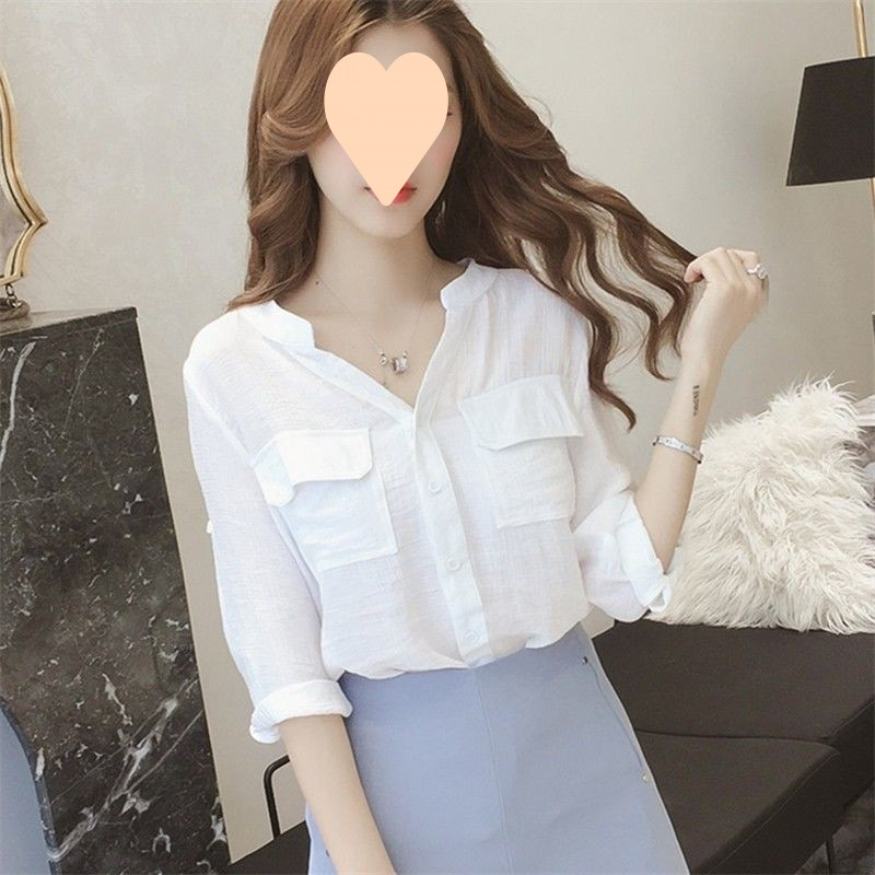 Pakaian Wanita Musim Semi dan Musim Panas Kaus Lengan 7/4 Kerah Korea Model Baru Kemeja Dalaman Murid Sekolah Longgar Mudah Dipadu Padan Warna Putih Kemeja Atasan
