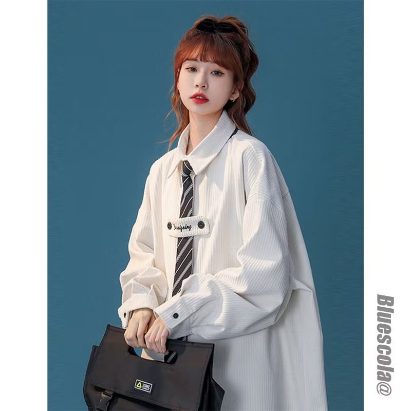 Kemeja longgar musim semi dan musim gugur untuk anak perempuan mantel siswa retro gaya Hong Kong kemeja lengan panjang gaya kuliah modis wanita korduroi