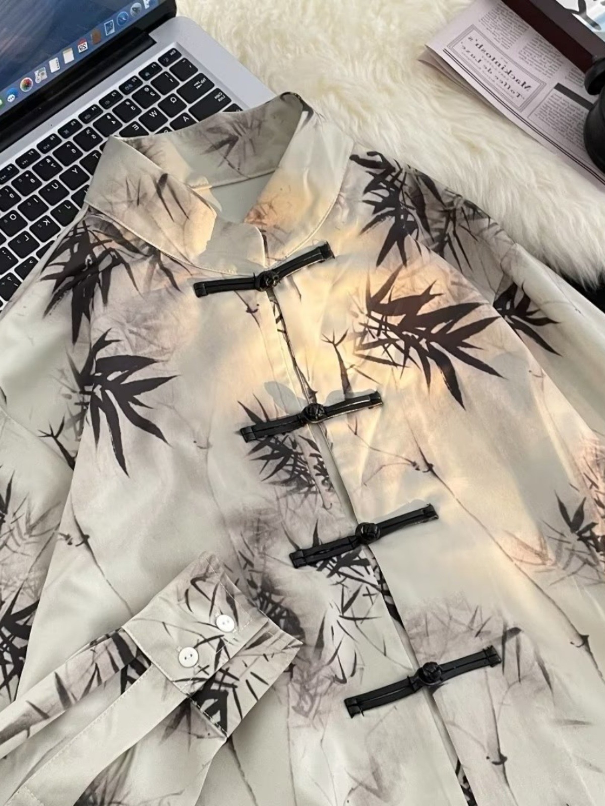 Kemeja lengan panjang gesper pelat tinta, baru gaya Cina kerah berdiri pria dan wanita siswa tipis gaya Cina Tang setelan jubah kemeja kasual
