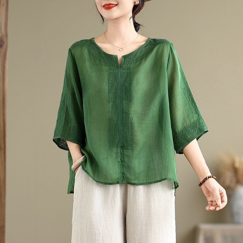 Kemeja Pullover Longgar Ukuran Besar Bordir Industri Berat Kemeja Wanita Musim Panas Leher Bulat Lengan Lima Perempat Kasual Warna Solid Bernapas