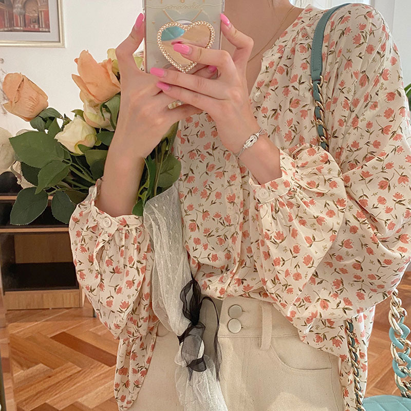 Kemeja motif bunga retro Prancis manis Atasan Wanita sifon leher-v pakaian gaya Korea longgar untuk pelajar musim gugur 2023