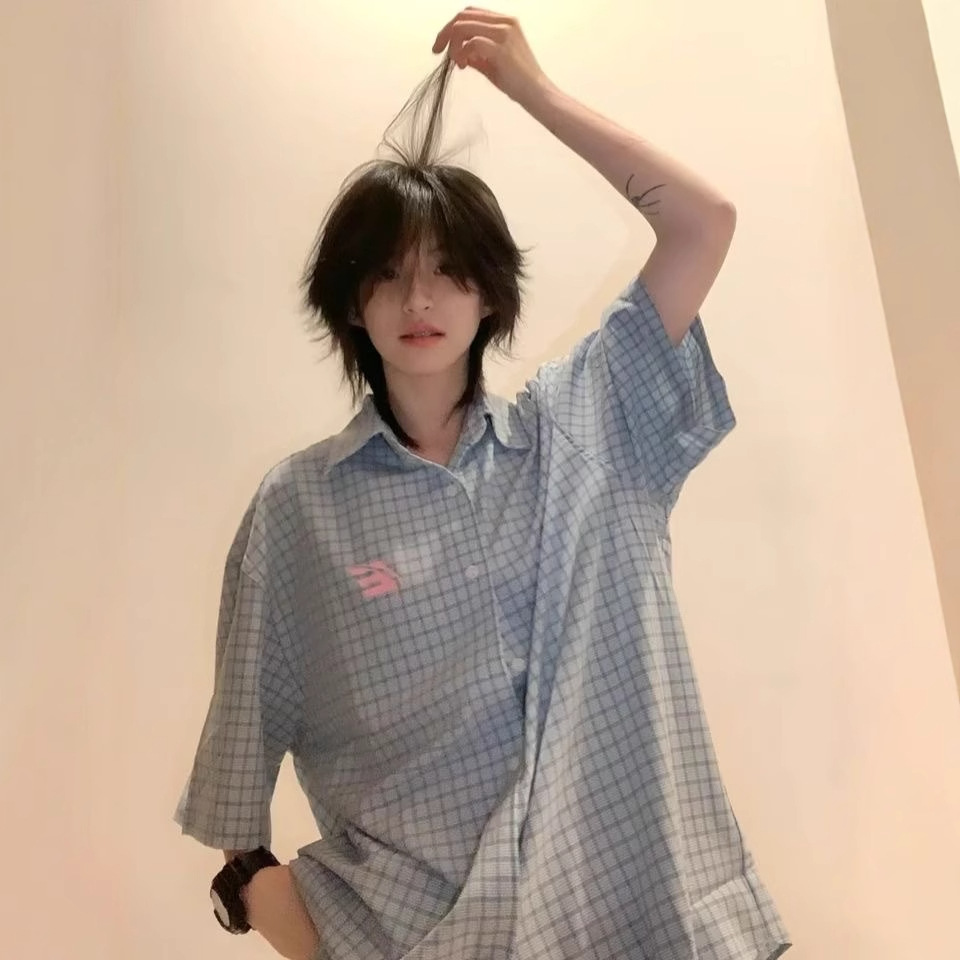 Kemeja Kotak-Kotak Lengan Pendek Warna Biru Retro Gaya Amerika Kemeja Murid Sekolah Santai Longgar Gaya Hong Kong Musim Panas Atasan Pria Kecil