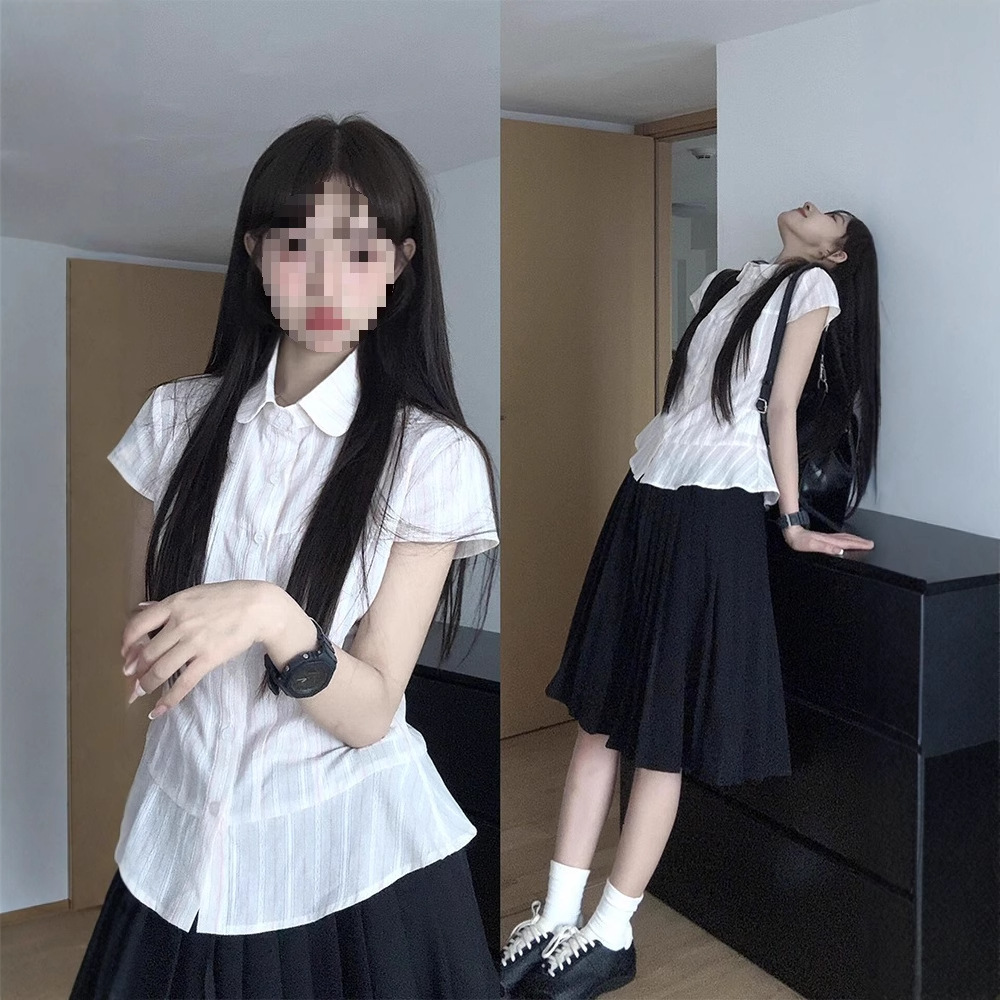 Kemeja kerah boneka lengan pendek untuk wanita, model baru musim panas 2025, tipis longgar retro, desain Prancis, atasan pelajar