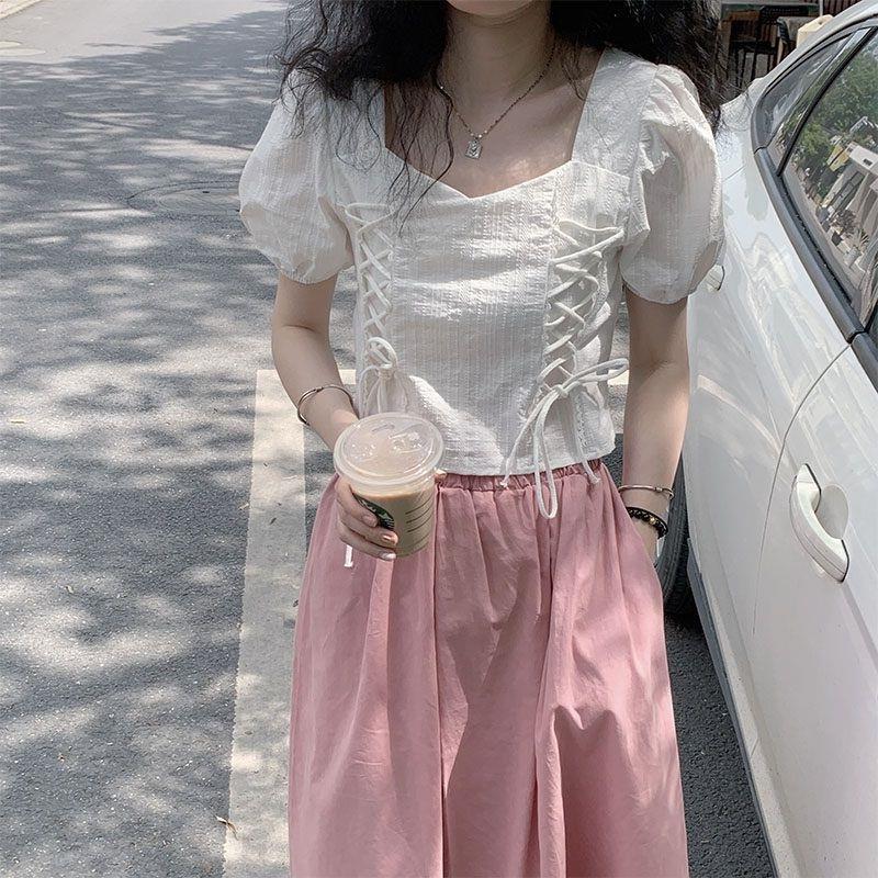Kemeja lengan puff kerah persegi Retro baju kecil manis Perancis musim panas wanita kemeja fashion Putih lace-up desain