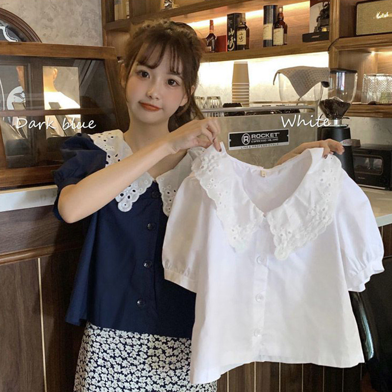 Kemeja lengan pendek manis Jepang untuk wanita, atasan desain bunga kerah boneka renda baru musim panas 2024