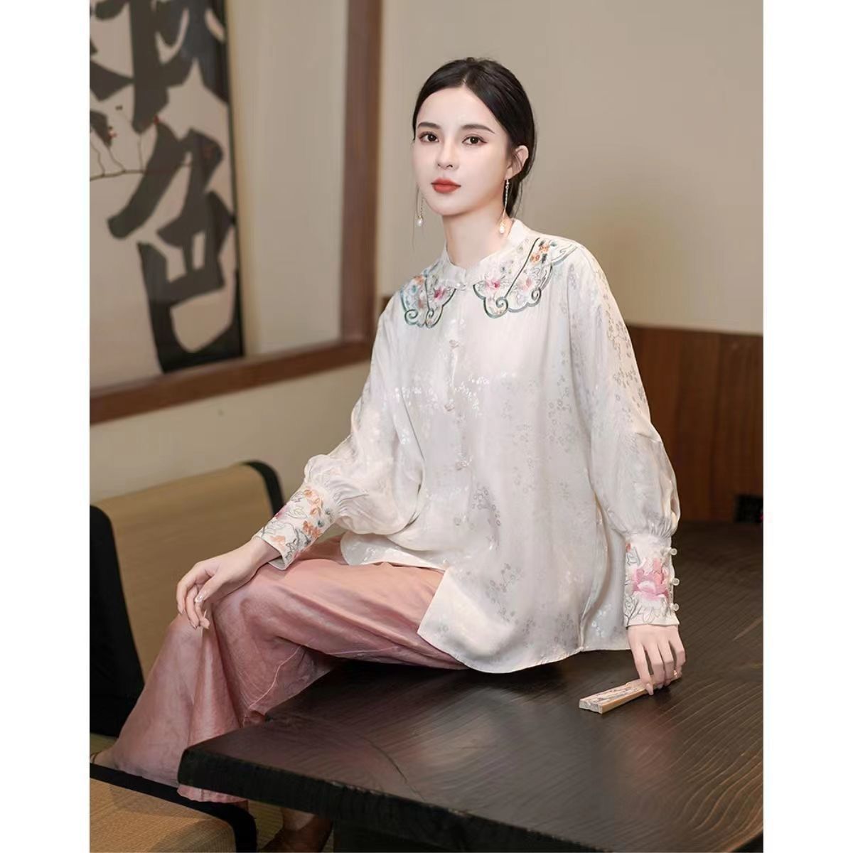 Baju lengan panjang longgar, baju lengan panjang atasan longgar China, baju kerah berdiri bordir gaya nasional, baju gaya China, gesper retro, awal musim semi 2024