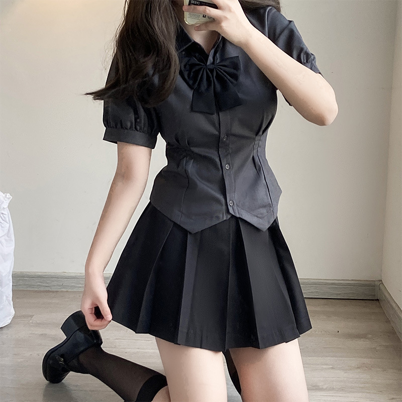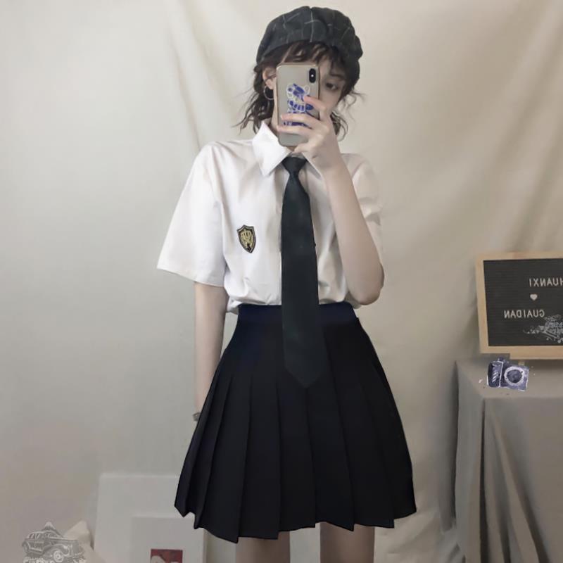 Setelan Kemeja Warna Polos Seragam JK Model Dasar Rok Lipit Warna Hitam untuk Sekolah Gaya Jepang Rok Pendek Gaya Preppy Musim Panas Wanita Set Lengkap