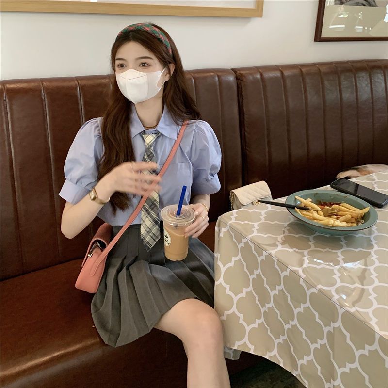 Kemeja wanita lengan pendek, pita warna solid jk musim panas seragam tersedia kancing puff Semua cocok pinggang lengan pendek kuliah