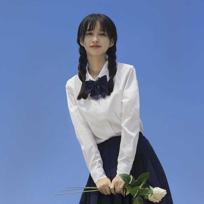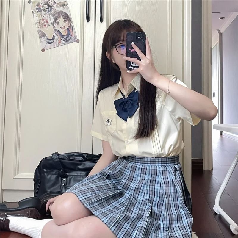 Kemeja putih leher bulat seragam JK asli, kemeja lengan panjang dan pendek bergaya sekolah Jepang, dipadukan dengan rok kotak-kotak, setelan bergaya sekolah.