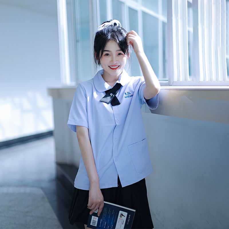 Setelan pakaian wanita lengan pendek, baju seragam wanita musim panas, dasar asli, kemeja lengan pendek, berlipat, organ, kelas wisuda, gaya kampus, musim panas