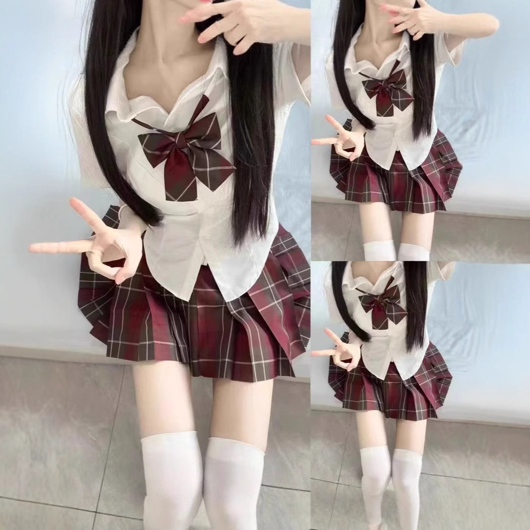 Setelan JK Seragam Gaya Jepang Kemeja Bertali Ketat Pinggang Manis dan Pedas Lengan Pendek Rok Lange Gaya Sekolahan Murni Wanita Rok Lipit